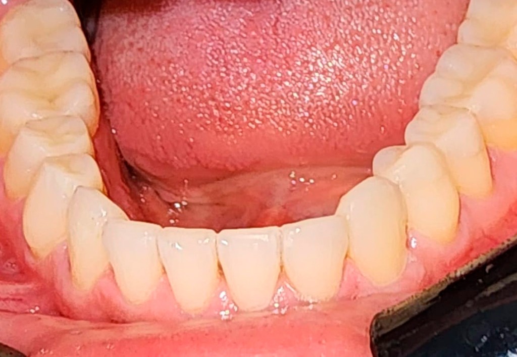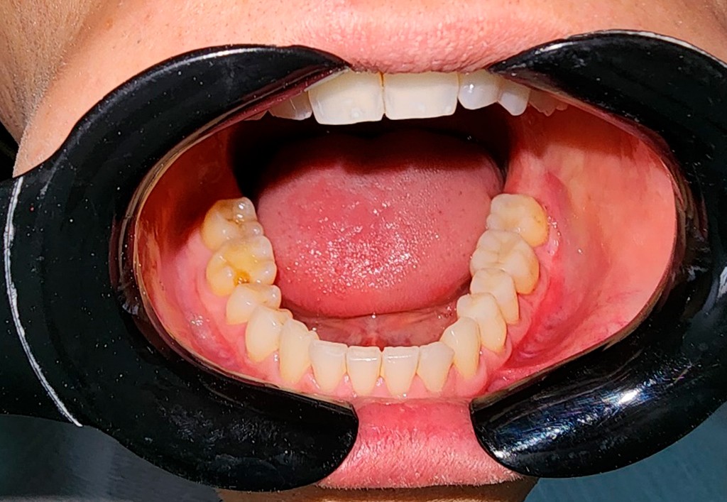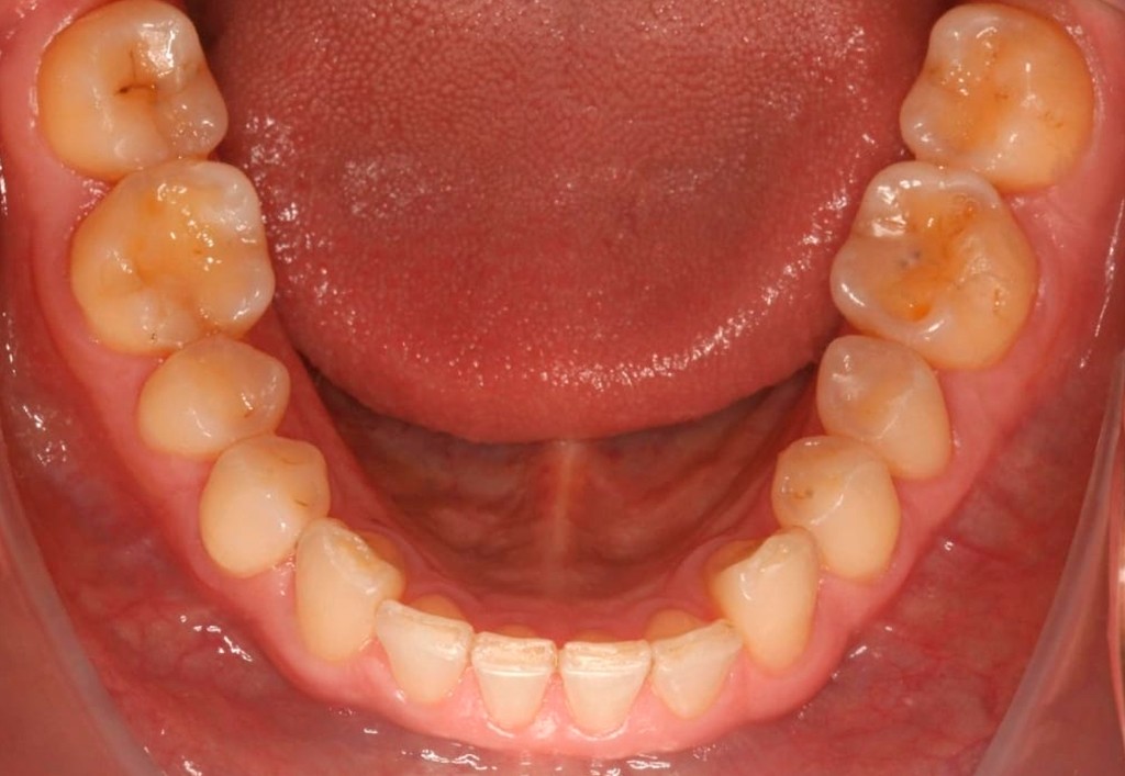Nesta imagem temos uma parte dos dentes reabilitada com table tops e outra não.